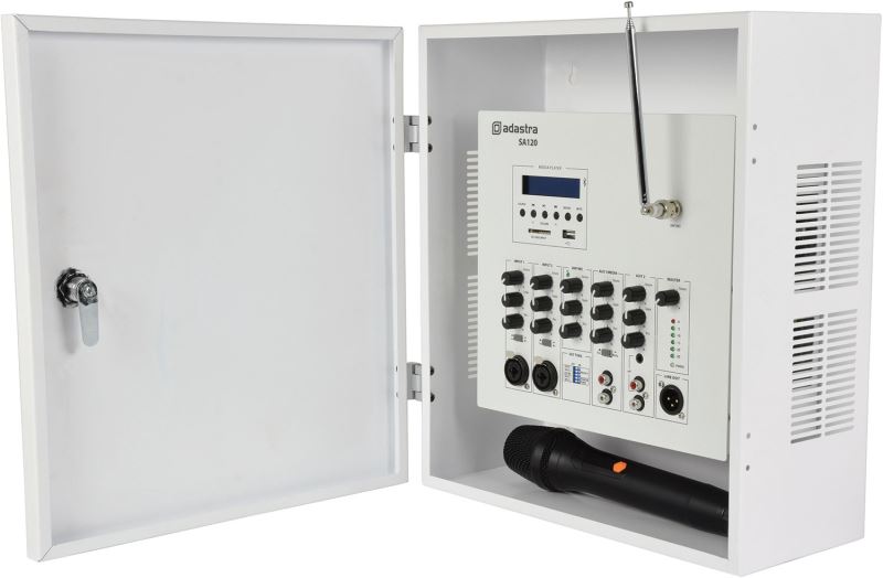 Public address mixer-amplifier built into a surface-mount secure box. A powerful output can drive either 100V line or low impedance speakers from binding post terminals inside the cabinet. The system includes a handheld UHF microphone with an inbuilt receiver and 2 switchable wired mic/line inputs are provided on combo XLR/jack sockets. Each mic input has switchable +48V phantom power and priority override, which mutes the Aux inputs during voice operation. An internal media player enables playback of audio tracks from USB/SD player, FM tuner or Bluetooth pairing. Alternatively, line inputs can be connected to the Aux 1 RCA sockets or separate Aux 2 RCA/3.5mm jack sockets. The combination of flexible input section and a high efficiency amplifier in a strong, lockable cabinet provides a complete solution for buildings where security and ease of use is essential.