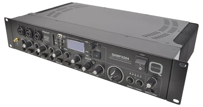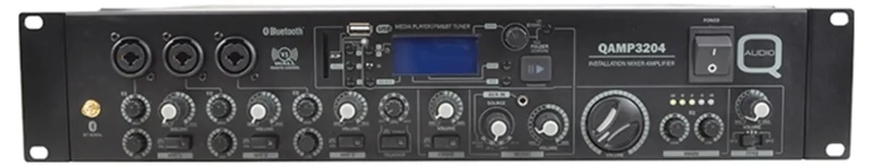 This Q audio low impedance installation amplifier offers powerful stereo output with 2 x100W at 8 Ohms, 2x 160W at 4 Ohms RMS. The QAMP3204 is ideal for various audio applications including bar, restaurant, gymnasium, and school installations. It includes a versatile mixer section accommodating 1 music and 3 microphone inputs. The music source is switchable between a media player and 3 external line inputs with gain control, and a front side 3.5mm jack line input.