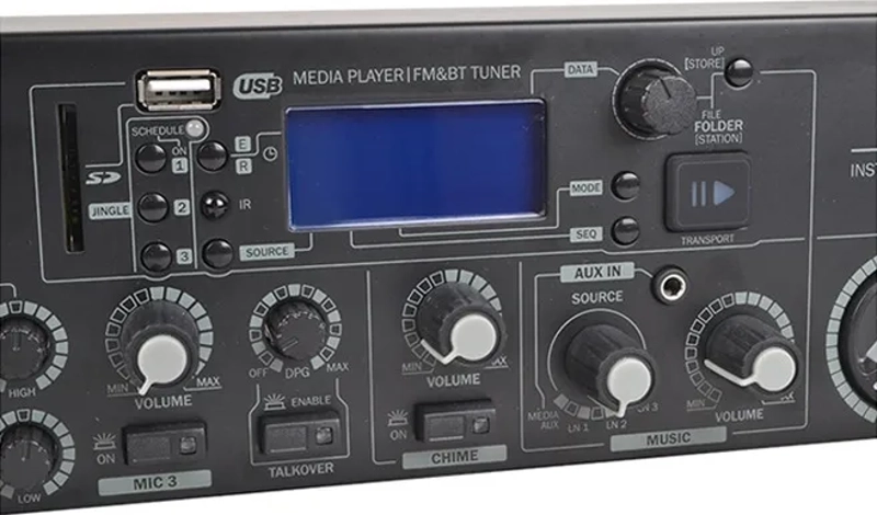The internal media player supports a FM tuner, Bluetooth receiver, USB thumb drives and SD cards up to 16GB/2000 songs, with MP3 file name display on a large LCD screen. It offers regular and random play modes, elapsed/remaining time display, and an FM tuner with RDS station information. The jingle player is an additional bonus feature for playing announcements and advertising, up to 3 jingles can be played. The jingles can be scheduled or played back via the pressing 1 of 3 switches on the front panel.