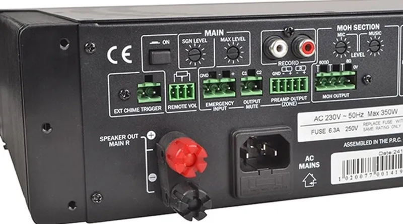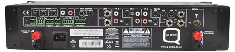 Microphone inputs are equipped with phantom power, isolation transformer (Mic 1 only), LPF & Gain controls at the rear, and volume and EQ controls at the front, along with an on/off switch. An adjustable auto talk-over function ensures automatic reduction of music levels during announcements.
