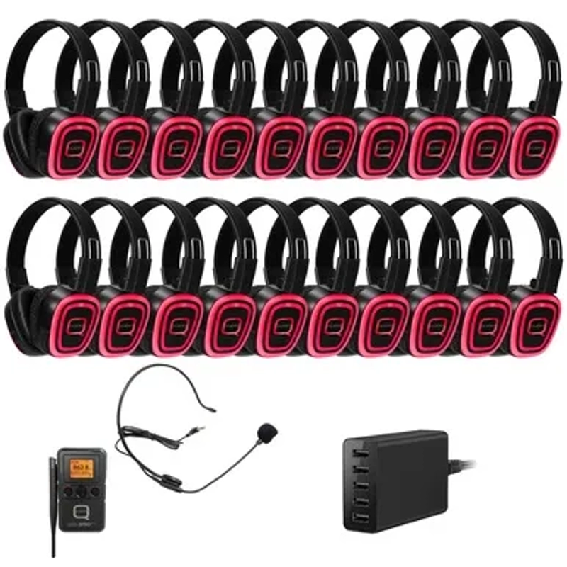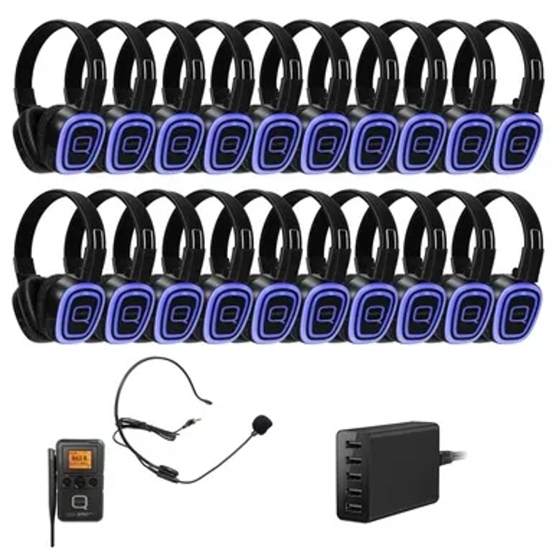 The 20 Way Silent Disco Bundle includes a Bluetooth Transmitter & 20-way charger, complete package for small events or conferences. It features twenty QSD-3PRO headset receivers, a QSD-3PRO BTX Portable Bluetooth transmitter for your audio source and transmission, and the SD-CH20 charging system that powers twenty headsets at once for fast resets between sessions.
