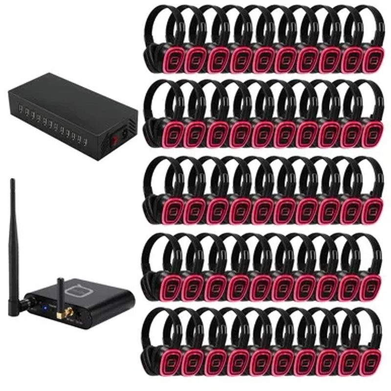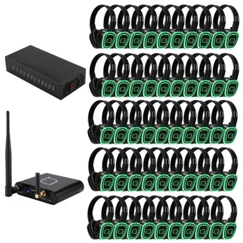 The 50 Way Silent Disco Bundle includes a Bluetooth Transmitter & 48-way charger, complete package for medium size events or conferences. It features fifty QSD-3PRO headset receivers, a QSD-3PRO TX Bluetooth transmitter for your audio source and transmission, and the SD-CH48 charging system that powers 48 headsets at once for fast resets between sessions.