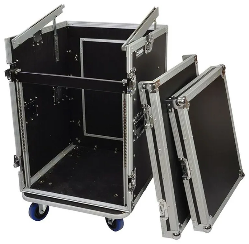 Durable combo flightcase with 12U under and 10U mixer top mounted on a ratchet system to elevate the control surface.