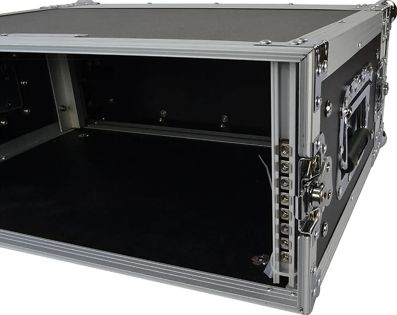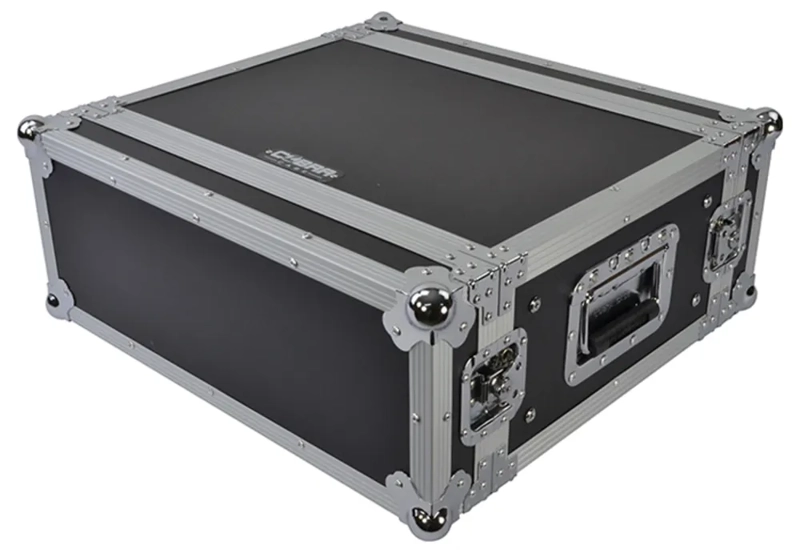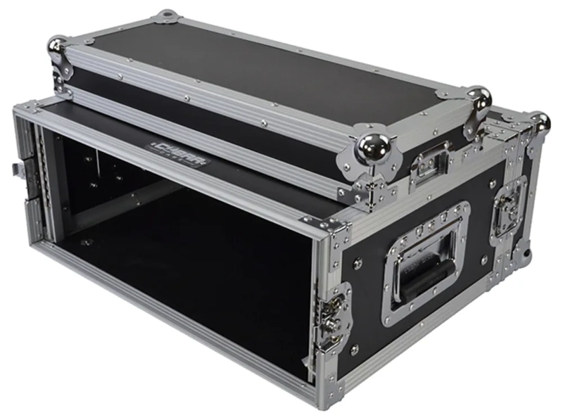 Heavy duty, durable 4U flight case for effects and control equipment. Designed for touring and studio applications. These shallow cases are for equipment up to 350mm deep. Front and back lids are removable and there are rack fixing bars front and back. Front and back panel controls and connectors can protrude into the lids, so equipment can be 400mm in overall depth. Constructed from black laminated 7mm ply with strong catches and fittings.
