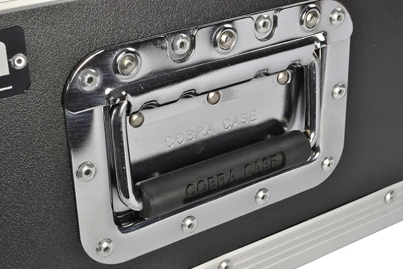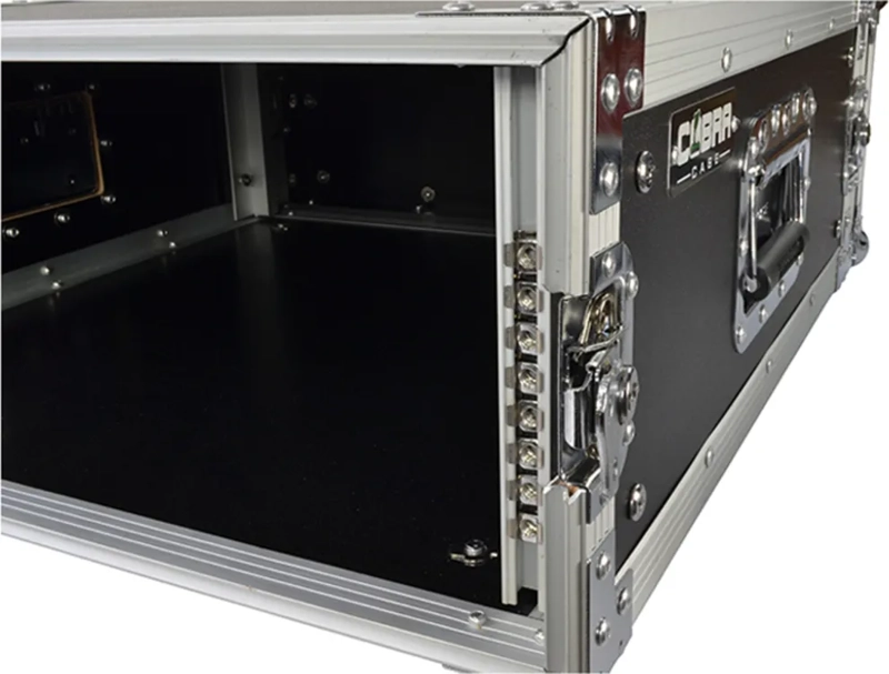 Tough Cobra 4U flight case made from laminated ply with full aluminium trim. Butterfly catches are fitted on all lids. Both front and back covers are removable and rack mounting strips are ready fitted and mounted front and back. Nominal equipment depth is 520mm, but front and back panel controls and connectors can protrude into the lids, equipment can be 570mm in overall depth.
