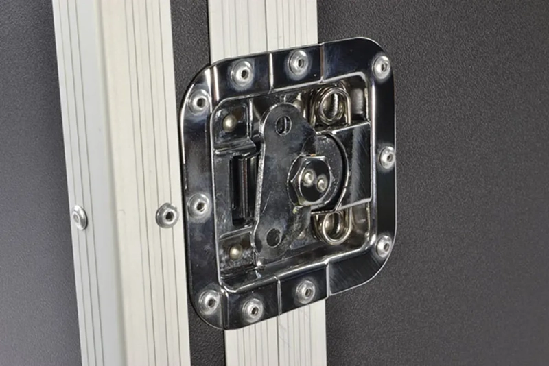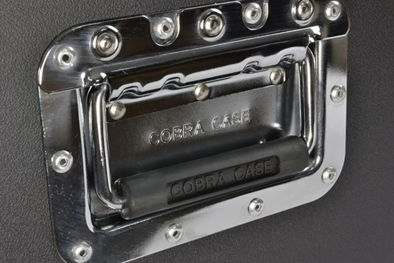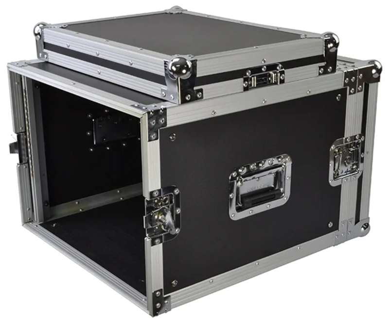 Tough Cobra 8U flight case made from laminated ply with full aluminium trim. Butterfly catches are fitted on all lids. Both front and back covers are removable and rack mounting strips are ready fitted and mounted front and back. Nominal equipment depth is 520mm, but front and back panel controls and connectors can protrude into the lids, equipment can be 570mm in overall depth