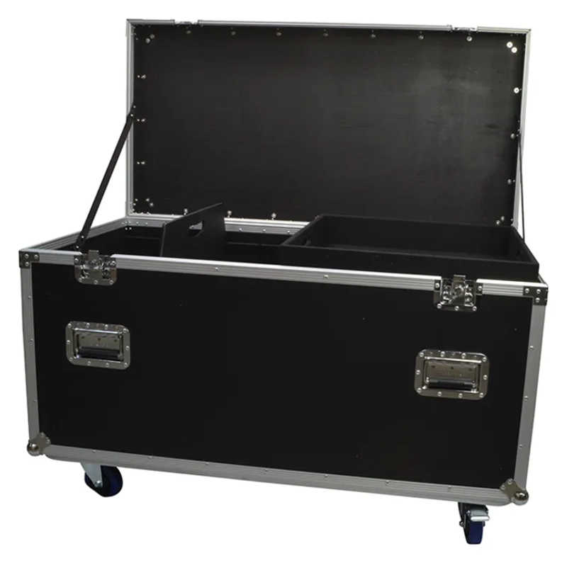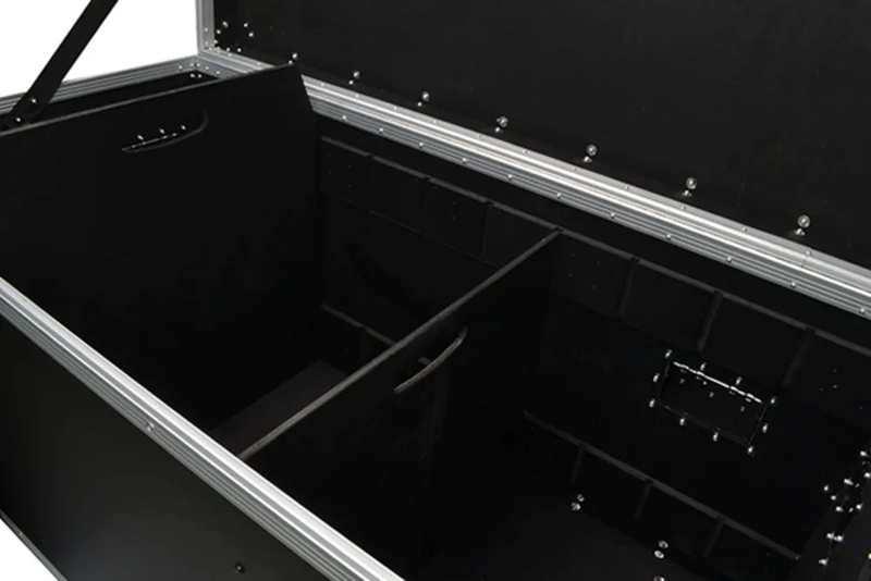 The case is manufactured from 10mm hardwood, covered with a tough black laminate. The edges are strengthened using aluminium trim and secured in place with strong rivets. Each side has two counter sunk extra heavy duty handles for lifting under load. The lid is permanently hinged ensuring it cannot be lost or misplaced with two metal robust catches for security and safety. Heavy-duty ball corners are fitted all round and the case underside has further wood reinforcing. Four 5 inch casters are supplied and can easily be screwed in place on the base, this will aid transportation. Internally, a carpet covered tray is supplied and fits into the case top, this can be removed and used when necessary. Compartments can be formed with internal removable dividers (3 are included) . These can be slid into grooves to make different size compartments.