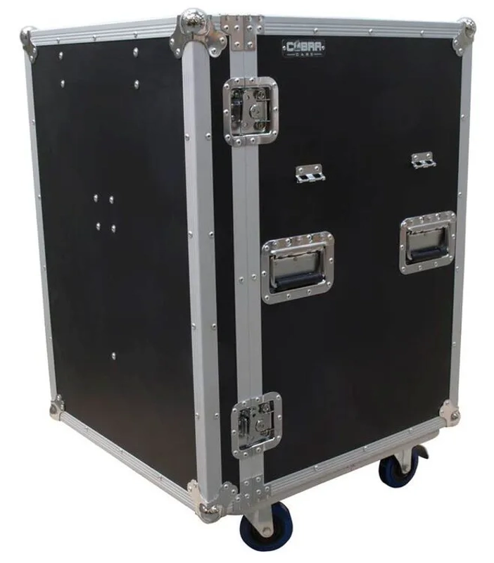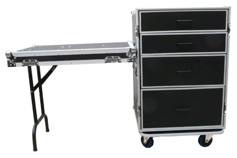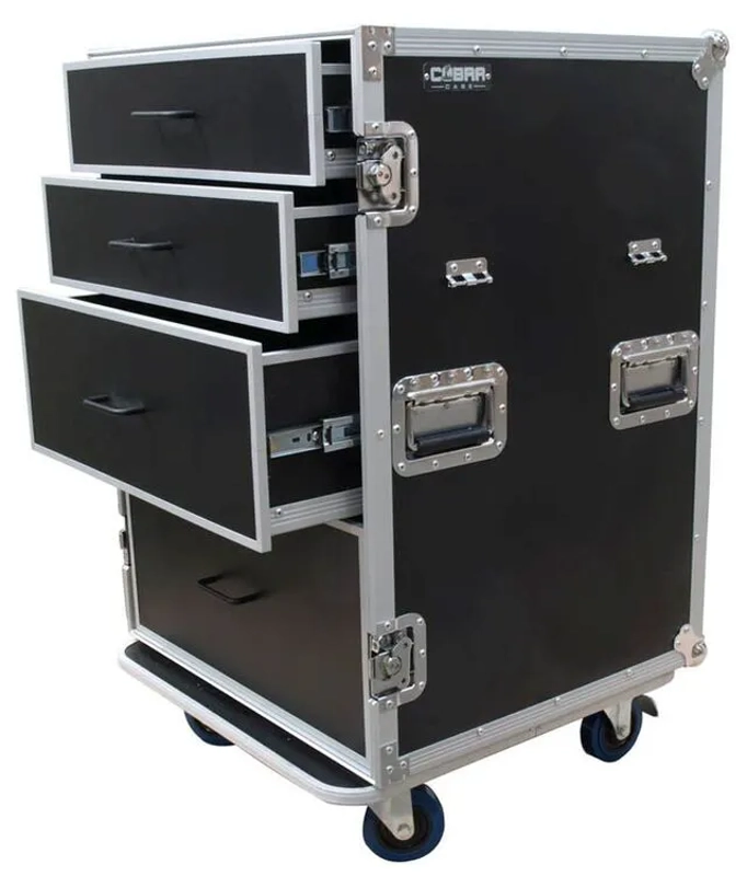 1x 6U, 1x 4U and 2x 2U rack drawers reside inside a sturdy flight case on wheels. The front lid transforms the flight case into a workstation by attaching to the side to form a table top.