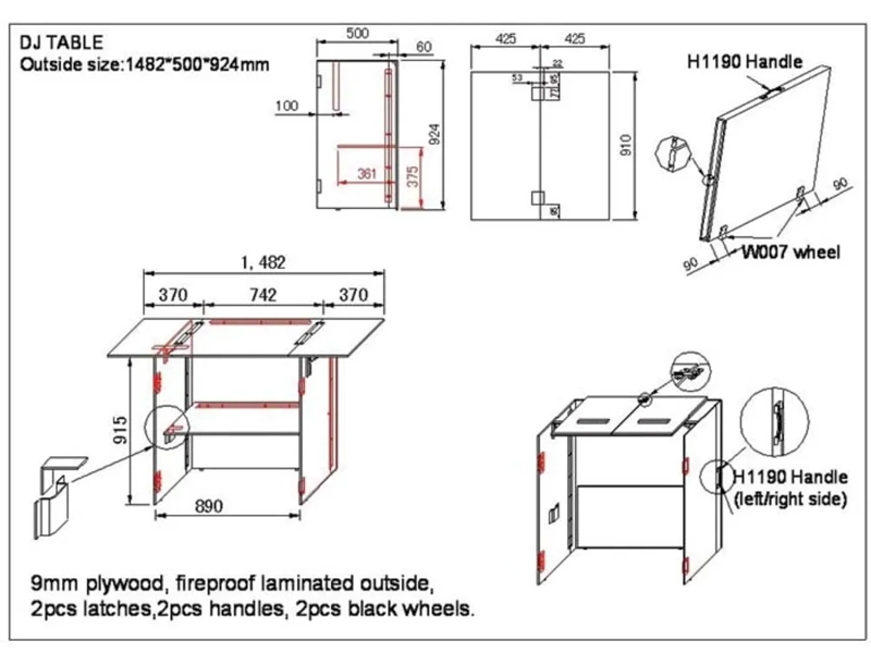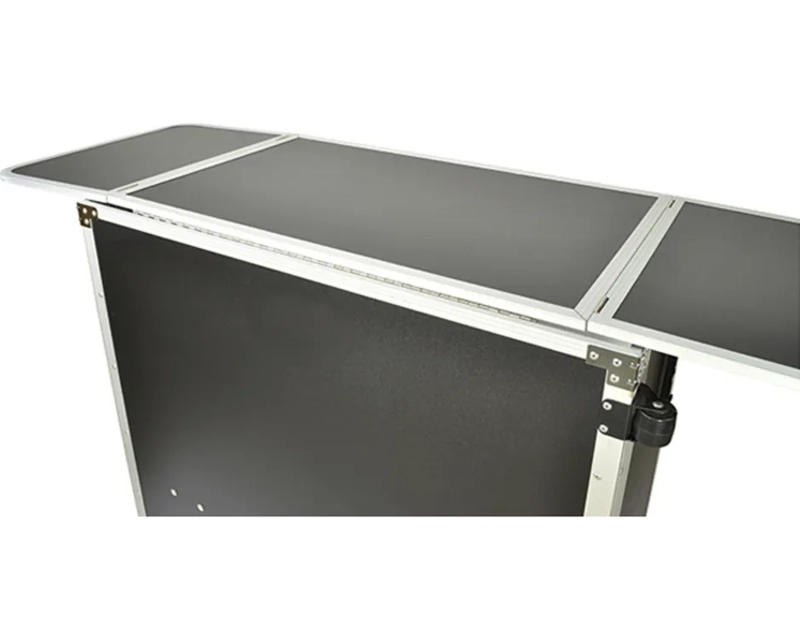 A fold flat flight style table and storage work place. Takes only minutes to assemble. This is a rugged piece of kit suitable for DJ's, presenters, bands, magicians and entertainers. Also works well on exhibition stands. Fitted with casters and high quality hardware.