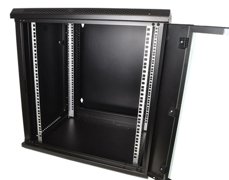 Wall-mounted metal 19" rack cabinets are ideal for audio-visual installations, providing a compact and organized solution for housing AV equipment such as amplifiers, receivers, and media players. Featuring a removable glass door, the cabinet allows clear visibility of the gear for easy monitoring while keeping it secure from dust and unauthorized access. The door is equipped with a sturdy locking mechanism, ensuring that the equipment remains protected. Switchable openings enhance the cabinet's versatility by allowing for efficient cable management and airflow, making it easy to access and connect devices while maintaining optimal cooling for the AV equipment.