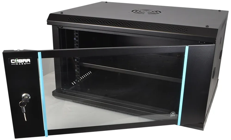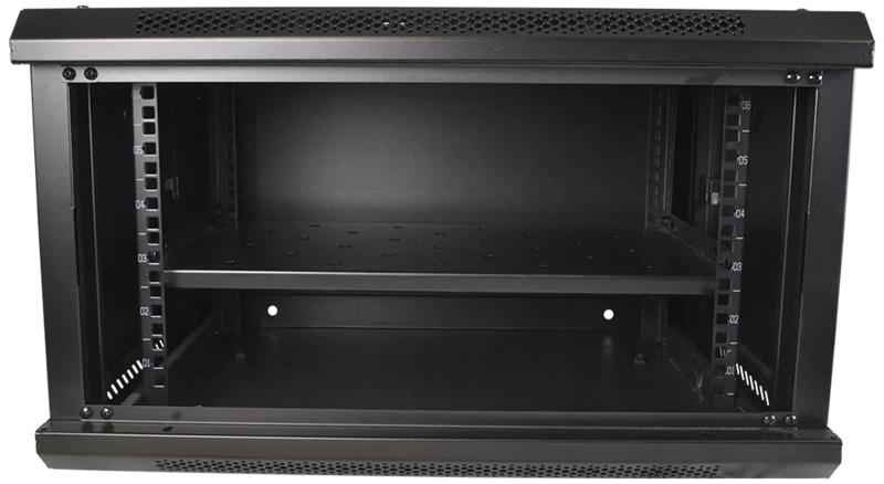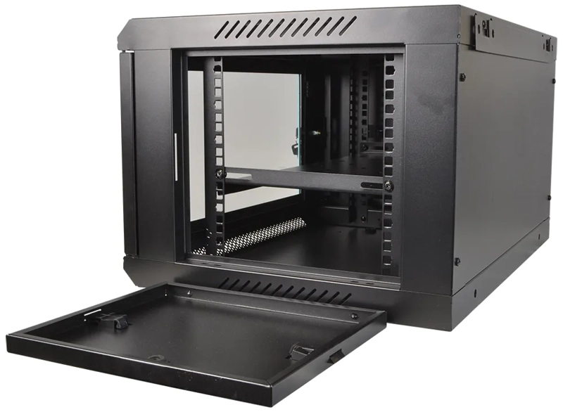 Wall-mounted metal 19" rack cabinets are ideal for audio-visual installations, providing a compact and organized solution for housing AV equipment such as amplifiers, receivers, and media players. Featuring a removable glass door, the cabinet allows clear visibility of the gear for easy monitoring while keeping it secure from dust and unauthorized access. The door is equipped with a sturdy locking mechanism, ensuring that the equipment remains protected. Switchable openings enhance the cabinet's versatility by allowing for efficient cable management and airflow, making it easy to access and connect devices while maintaining optimal cooling for the AV equipment.