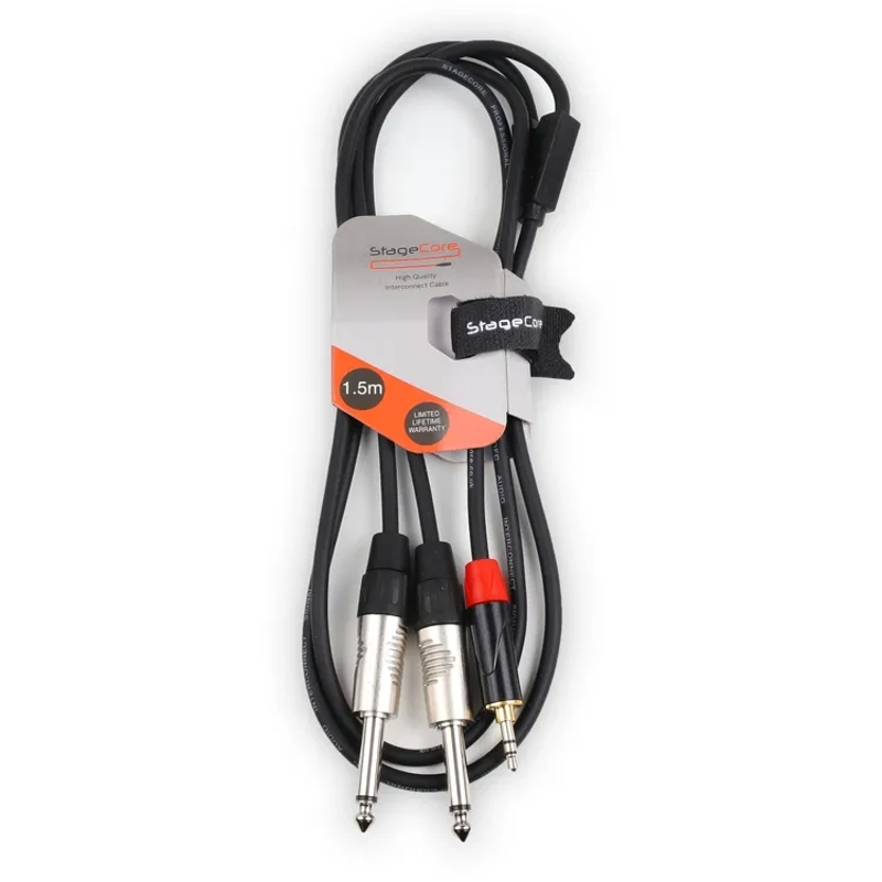 3.5mm Stereo Mini Jack Plug - 2 x 6.35mm Mono Jack Plugs, Professional Audio Signal Cable - Includes Hook & Loop Tie - The unique 3.5mm jack plug has been designed with an oversized spacer collar to allow connection to devices fitted with protection cases.