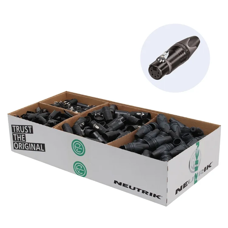 5 pole female cable connector with black metal housing and silver contacts. The next generation of the worldwide accepted standard of XLR cable connectors. The successor of the X series offers several new features which make it more reliable, easier to assemble and improves contact integrity as well cable strain relief. Disassembled box of 100