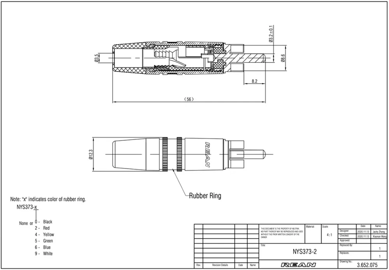 Phono plug, black housing, gold plated contacts, rubber anti-kink boot, chuck type strain relief, cable O.D. 3.5 - 6.1 mm