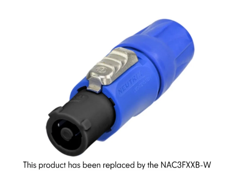 Lockable cable connector, power-in, screw terminals, blue. The powerCON is a locking 3 conductor equipment AC connector with contacts for line, neutral and pre-mating ground contact. It replaces appliance couplers wherever a very rugged solution in combination with a locking device is needed in order to guarantee a safe power connection.