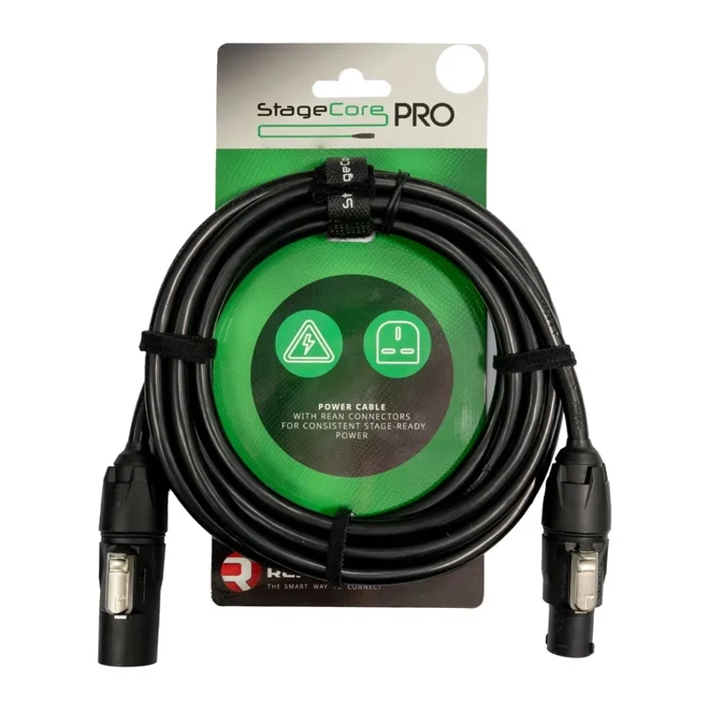 StageCore power cable fitted with REAN TRUE1 locking connectors (female to male). Designed for professional use in linking power between compatible loudspeakers, lighting fixtures and AV processors. The secure locking mechanism ensures stable operation in demanding environments.