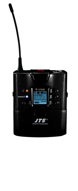The JTS R 4 quad channel UHF professional wireless system available as a self assembly kit comprising of everything you need to build a multi channel wireless system. We are able to supply with Hand Held transmitters, Body Pack transmitters or a self selection 'Pick & Mix' option. It boasts superb operating distance and a one-touch set-up facility,  REMOSET, which can set all parameters of the transmitter within an effective distance of 10 metres or more. Controllable via REMOSET are functions including Frequency Data, RF Power, Sensitivity, Low Cut, Key Lock and User name.