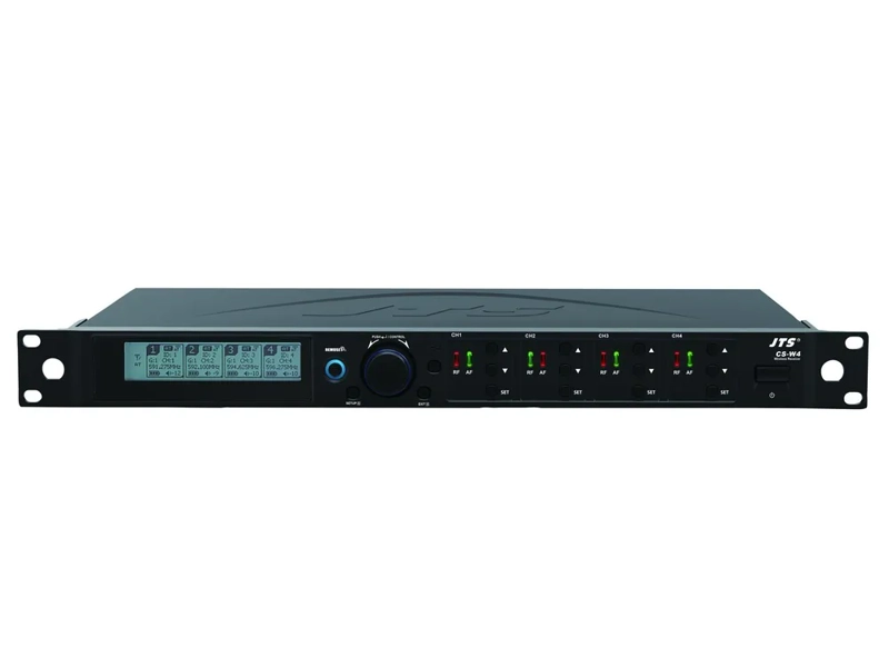CS-W4C is designed with JTS newest wireless and conferencing technology. It provides maximised compatible channels within the available bandwidth. Built in logic circuit provides conferencing features. A microphone assigned with priority will work as a chairman unit. It overrides other microphones. Logic setting of one CS-W4C receivers can be cascaded. A microphone with priority in one receiver will also have priority in a cascaded system. JTS patented REMOSET synchronises all four microphones simultaneously by push one button.
