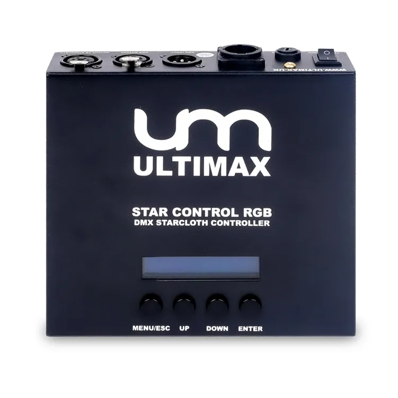 The Ultimax Star Control RGB is a robust, all-in-one control unit designed to power and manage your Ultimax RGB starcloth with confidence. Built into a full metal casing, it delivers reliable performance for mobile DJs, venues and event production, with intuitive operation via a clear 2 bar LCD display and four dedicated control buttons.