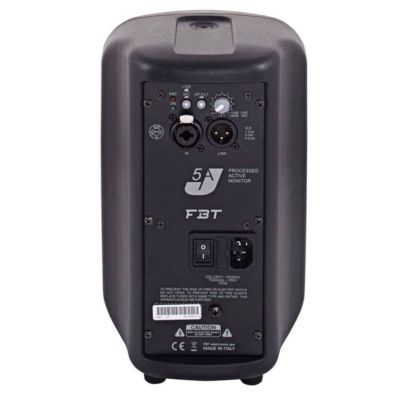 The bi-amplified FBT J5A active speaker feature a 80W RMS low frequency amp and a 40W RMS high frequency amp. The control panel features a level control, HP filter switch, mic/line selector, led power on, protection led indicator, a balanced Neutrik input combo-jack, balanced XLR link out.