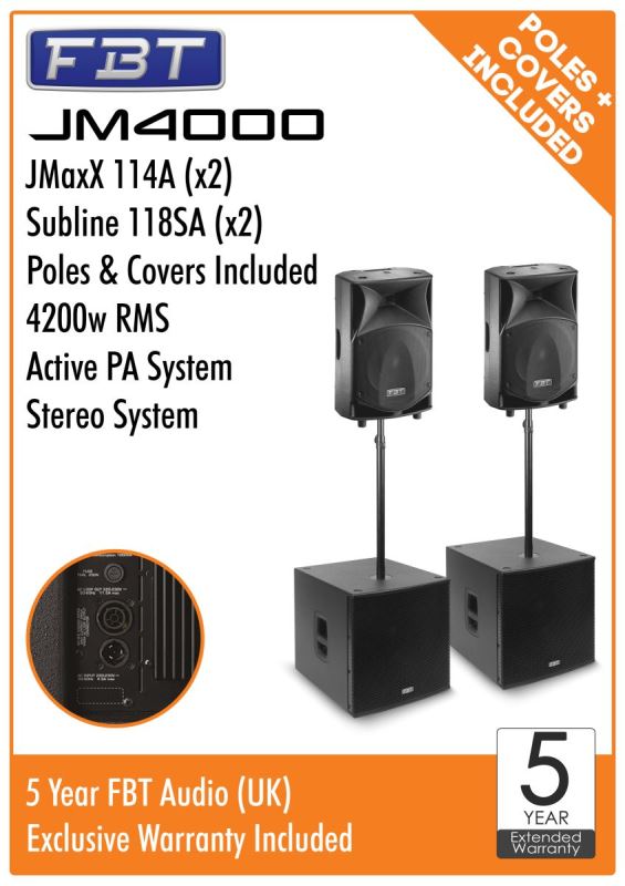 FBT JM4000 Active PA Package 4200w RMS 2x JMaxx 114A 2x Subline 118SA + Poles + Covers
