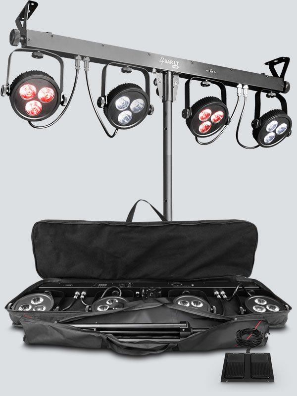 4BAR LT USB is a complete wash lighting system with D-Fi USB compatibility for wireless Master/Slave or DMX control. Four fully adjustable round pods each with three 9 watt LEDs achieve total room or stage coverage. Create coordinated light shows in Master/Slave mode and easily control static colors and automated programs with the optional IRC-6 remote. You can easily set up and tear down in seconds with the included tripod, carry bags and footswitch.