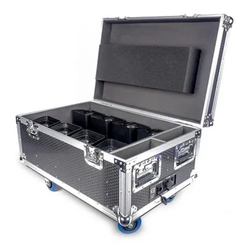 The Flux FC8 charging flight case charges 8 uplighters simultaneously using wireless contact plates, with TRUE1 power input and output, two accessory compartments, a stackable lid, and four castors with two braked. Built as a heavy-duty flight case for dependable transport and quick on-site deployment.