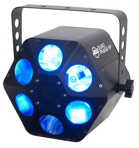 The Quad Phase HP also offers all the latest features sought after in special effects lights such as: DMX-512 for programming or linking capabilities, exciting built-in sound active programs, no duty cycle (run all night), a long life LED source (30,000 hours), 4-button DMX display on rear (for easier programmability), IEC power daisy-chaining, a 1.8 steeper motor for smooth movement and comes with the ADJ UC IR wireless remote. Use the Quad Phase HP at your next gig and create loads of memories.