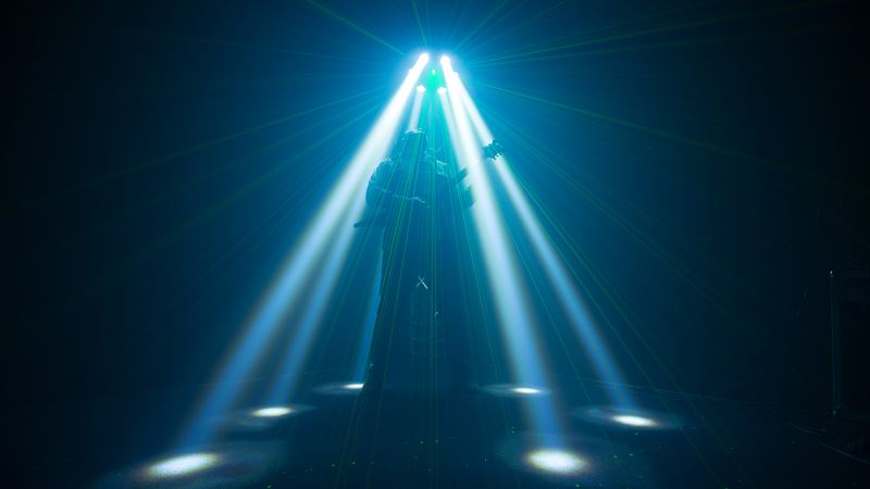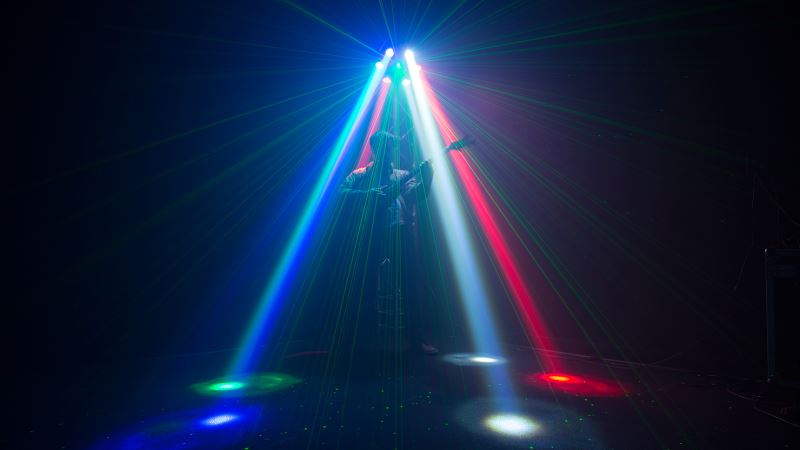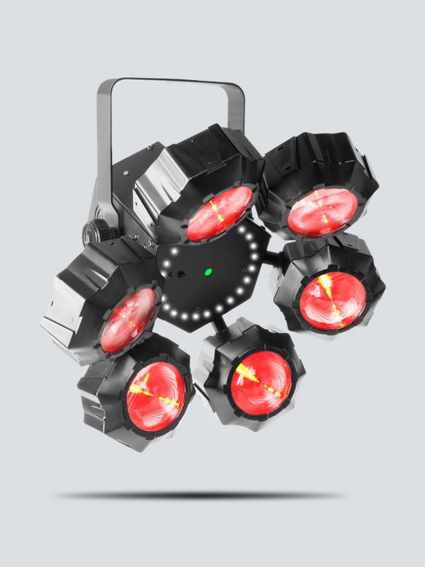 - A multi-effect light that includes adjustable RGBW beams, a round SMD strobe and a red/green pattern laser