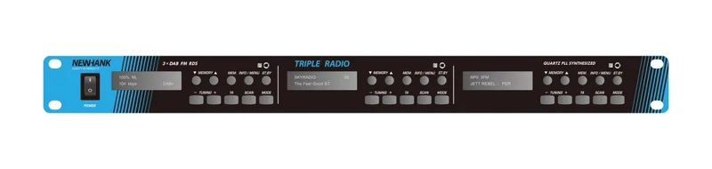 Newhank Triple Radio is a 3 independent DAB / FM RDS Stereo Tuners in 1 unit 19-inch housing. Able to output 3 of your preferred Digital or Analog Radio stations at the same time. Perfect for inside any redundant professional distributed audio system.
