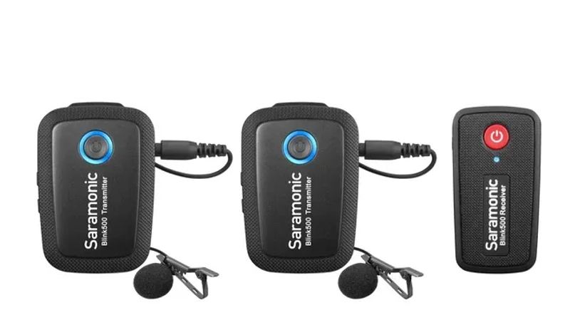 If you want an extremely small, feather-weight wireless microphone system that delivers broadcast-quality sound to use with cameras and mobile devices, with the ability to handle two wireless transmitters so you can put mics on two separate people, nothing is capable of doing this except for the Saramonic Blink 500 B2. It comes with two clip-on wireless transmitters that have built-in mics, two professional lavalier microphones, and a dual-channel receiver that mounts to the shoe of your camera. You can put mics on two separate people, and it will work perfectly with the included ultracompact dual receiver.