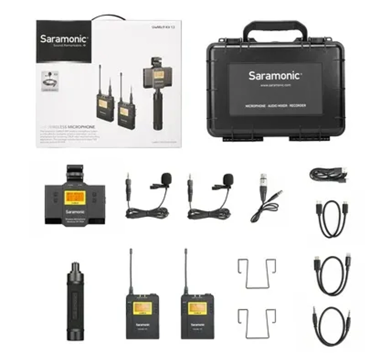 The Saramonic UwMic9 KIT13 (SP-RX9+TX9+TX9) is a portable, dual-channel, UHF wireless microphone system that was designed to be used with an iPhone or Android smartphones, as well as cameras and other devices. It lets you use two, separate wireless beltpack transmitters with lavalier mics at the same time and includes multiple output cables with Lightning for Apple devices, USB-C for Android, and analog 3.5 mm for cameras and other devices. A smartphone holder is built into the receiver, and a removable handgrip stabilizes your mobile videos. A shoe mount at the top lets you to attach important accessories, such as video lights and shotgun microphones.