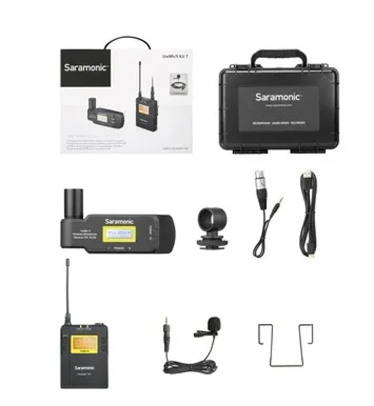 The Saramonic UwMic9 KIT7 (TX9+RX-XLR9) is an ultra-portable, dual-channel, camera-mountable wireless UHF lavalier system that has powerful features which greatly exceed the capabilities of wireless systems that cost over twice as much. It allows you to use wireless microphones on two separate people (when you add an additional transmitter, which is sold separately). If you ever need more than one wireless microphone in the future, you can easily and affordably expand this system. This system is easy to use, features durable metal construction, and provides pristine, broadcast-quality sound for interviews, film dialog, field recording, TV and news gathering.
