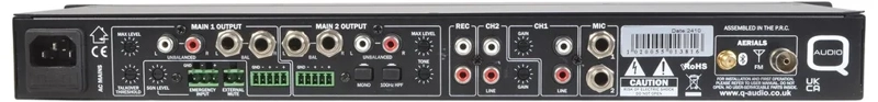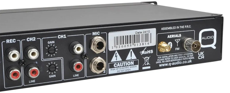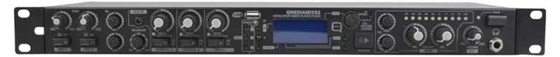 The Q-Audio QMEDIAMIX52 media installation mixer features 3 stereo inputs, 2 microphone inputs and multimedia player with Bluretooth receiver, FM tuner, and USB input.