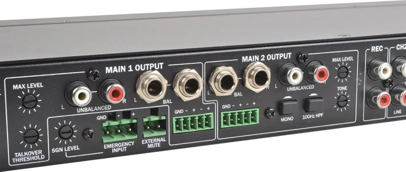 An emergency input overrides the master output to play the emergency signal, and an output mute contact allows for external muting.