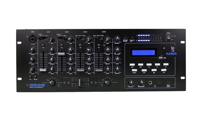 Product Description The Playmate is a compact 4u mixer. 6 line input pluds 2 x phono inputs and 3 microphone inputs. Stereo Zone outputs. Built in USB or SD Card media player.