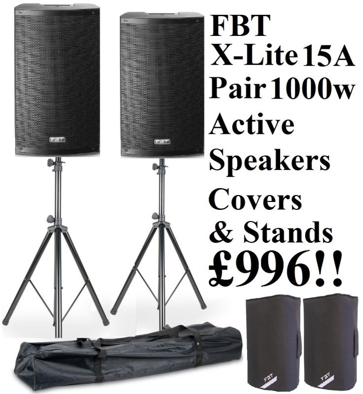 FBT X-Lite 15A Active 1000w Speakers Covers & ADJ SPSX2B Stands & Bag Package Xlite