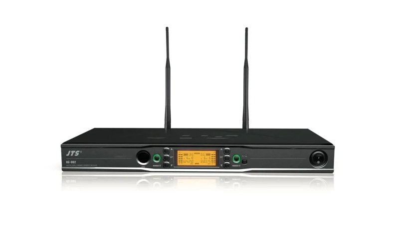 RU-992 receiver is a full rack version of RU-8012DB series with JTS 2nd generation wireless technology. To cope with the squeezed radio spectrum, the system provides more compatible channels within limited bandwidth. The patent pending REMOSET sends the scanned channel data to transmitter by pushing a button. To meet critical audio demand general noise and hiss has been reduced to an extremely low level. 100 meter operation range meets most demand from most applications. To be environment friendly an integrated charger is available on option.