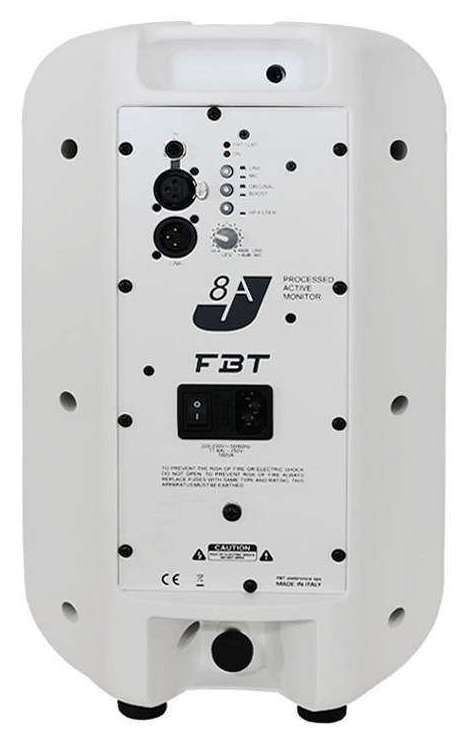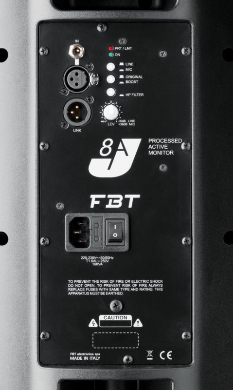 A front face steel grille protects the speaker from external damage. The bi-amplified FBT J8Aactive speaker feature a 200W RMS low frequency amp and a 50W RMS high frequency amp. The control panel features a level control, HP filter switch, mic/line selector, preset switch (original, boost) led
