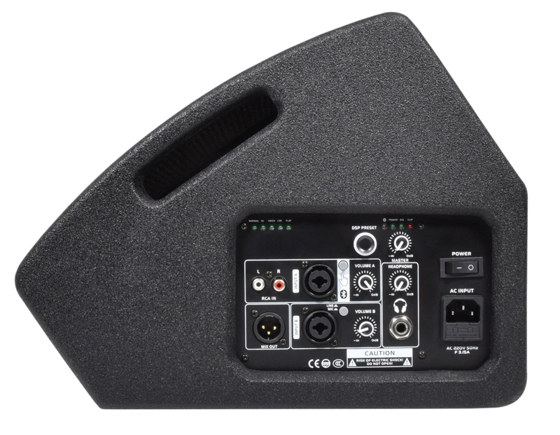 Active wedge speaker in a durable, texture coated wooden cabinet with minimal footprint. The main driver delivers punchy low frequencies with the help of 2 bass ports and a concentric titanium tweeter is mounted within the main driver for perfectly aligned, sparkling high frequencies. An arched powder-coated steel grille provides heavy duty protection from the rigours of stage performances and forms 2 side handle holes for easy portability. Powered from its inbuilt class-D amplifier, each wedge has enough output to deliver clear sound quality in high SPL situations and is even serviceable independently as a compact PA cabinet, thanks to the 35mmØ pole mount socket and M8 flying points. A DSP section provides 5 different EQ profiles to accurately match the program material and sound environment. In addition to a mic/lin input and separate line input, the CM-series wedges also have a Bluetooth® receiver, which makes it ideal as a musician's practice amplifier. Surprisingly powerful in such a compact enclosure, this speaker offers high quality sound output with flexible options for stage foldback, keyboard and e-drum amplification.