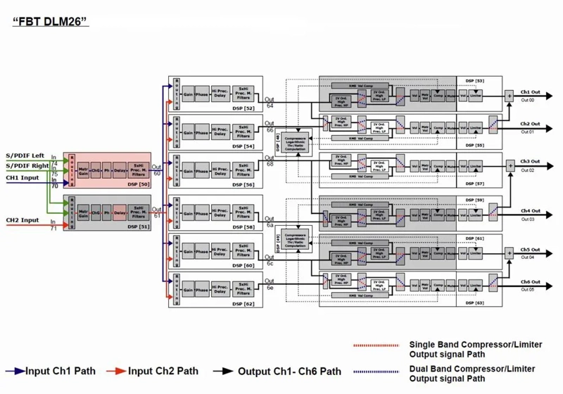 The DLM26 is a DSP based 2 input x 6 output Digital Loudspeaker management processor, ideally suited for fixed installations and live events. It combines the functions of a multitude of conventional products in a compact 1U unit with extensive PC remote control capabilities.The DLM 26 features superb audio quality with premium hi-end AKM5392 24bit A/D converters and AKM 4396 24bit D/A converters, carefully optimized double precision signal processing coupled with 24bit conversion ensure a dynamic range >110db.