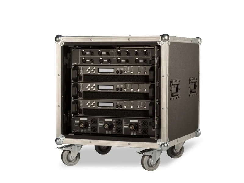This Touring rack is equipped with a mains power distribution device, which also serves as a loudspeaker connector panel. Also incorporated is an I/O panel which serves as a connector interface for both analog and digital audio signals as well as four network connectors for Ethernet remote capabilities.