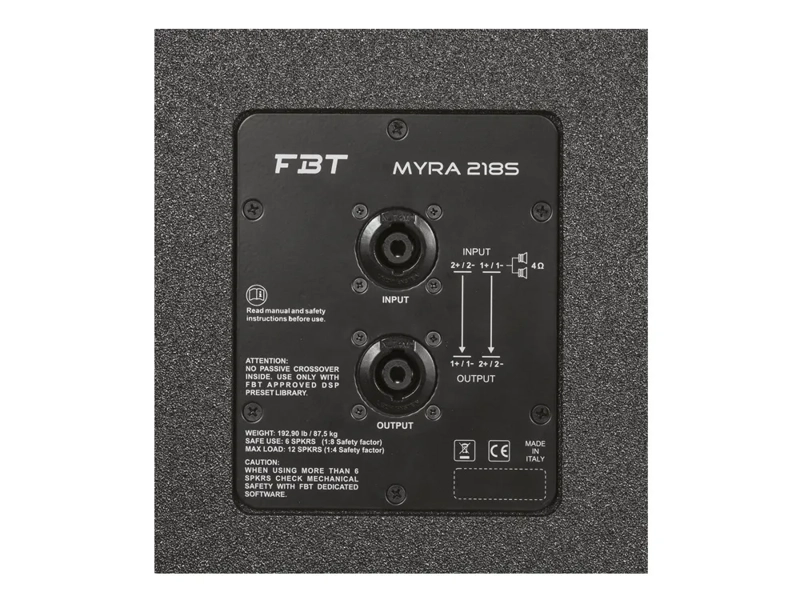 The MYRA 214L is Bi-Amped through a NEUTRIK NL4M connectors, one channel for LF and one for the MID/HF with internal passive crossover. The lowest octave of the Myra system is seamlessly reproduced by the companion 218S, a reflex-loaded dual 18-inch subwoofer featuring custom-designed, very long excursion B&C drivers.
