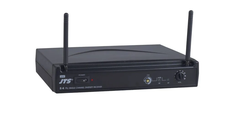The JTS E-6 is a UHF single channel PLL diversity receiver for use with the E-6TH and E-6TB handheld and bodypack transmitters.